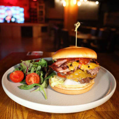 chifla, carne de vita, salata iceberg, castraveti murati, branza cheddar, bacon, ardei kapia murati, sosul casei, ceapa rosie, cartofi prajiti