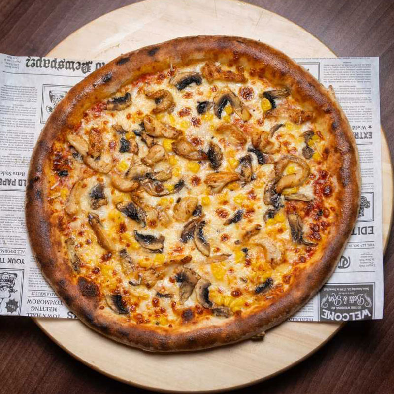 aluat homemade, sos pizza, mozzarella, piept de pui, ciuperci, porumb, parmezan 600g
