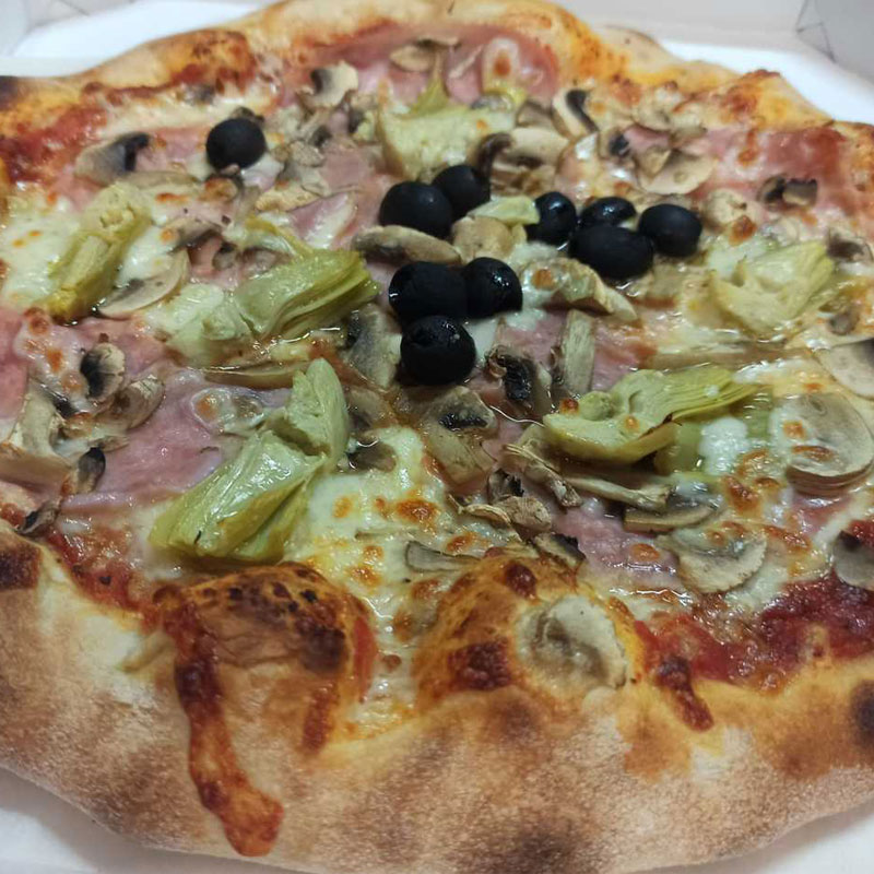 aluat homemade, sos pizza, mozzarella, salam, prosciutto cotto, ciuperci, măsline 480g